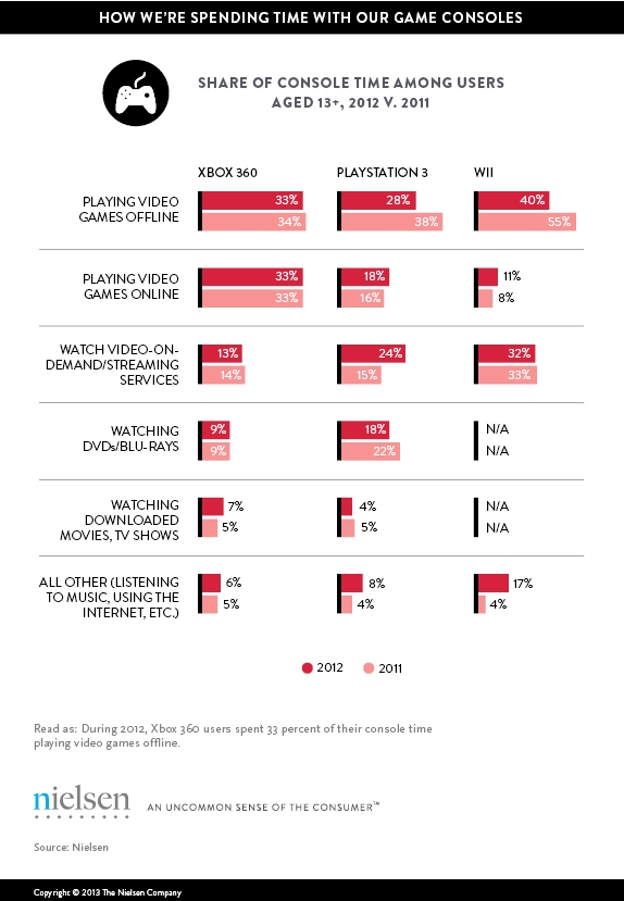 Secondo i dati dell'indagine Nielsen, sono gli utenti PlayStation 3 ad aver cambiato maggiormente le proprie abitudini nell'utilizzo della console. Gli utenti PS3 spendono, infatti, un quarto del loro tempo dedicato alla console a guardare film o spettacoli televisivi, con un dato in crescita del 15% nel 2012 rispetto a quanto registrato nell'anno precedente.