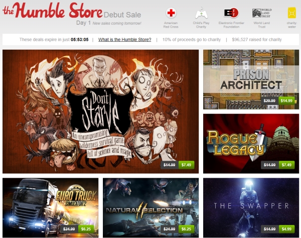 Nonostante queste limitazioni rispetto al modello originale, i giochi presenti nell'Humble Store hanno prezzo molto contenuto, e sono particolarmente interessanti dal punto di vista della qualità. Nove giochi sono disponibili a un prezzo fortemente scontato, fino al 50%. L'offerta è limitata alle prime 24 ore dall'apertura dello Store, quindi affrettatevi se ne volete usufruire. Tra gli altri giochi in offerta, al momento troviamo Don't Starve, Euro Truck Simulator 2, Orcs Must Die! 2 e Natural Selection.
