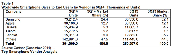 Le nuove analisi di mercato degli smartphone di Garter del terzo trimestre del 2014 sorridono soprattutto ai produttori cinesi. Samsung e Apple, rispettivamente in prima e seconda posizione, occupano adesso il 37% dell'intero mercato, un numero che si rivela come in costante declino (7%) rispetto ai dati dello stesso periodo dell'anno scorso. Nei tre mesi analizzati da Gartner sono stati venduti 456 milioni di telefoni, 301 milioni dei quali considerabili smartphone.